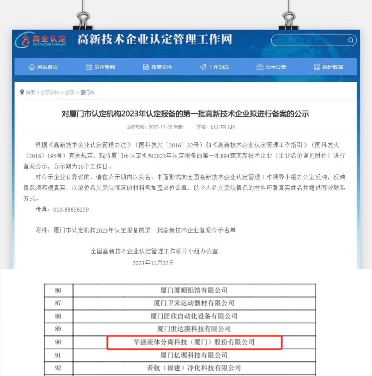 近日,全国高新技术企业认定管理工作领导小组办公室发布了《厦门市认定机构2023年认定报备的第一批高新技术企业备案名单》,开云在线娱乐流体分离科技(厦门)股份有限公司顺利通过了国家高新技术企业认定,再次获得“国家高新技术企业”荣誉称号,这标志着开云在线娱乐科技创新水平又一次获得了认可。